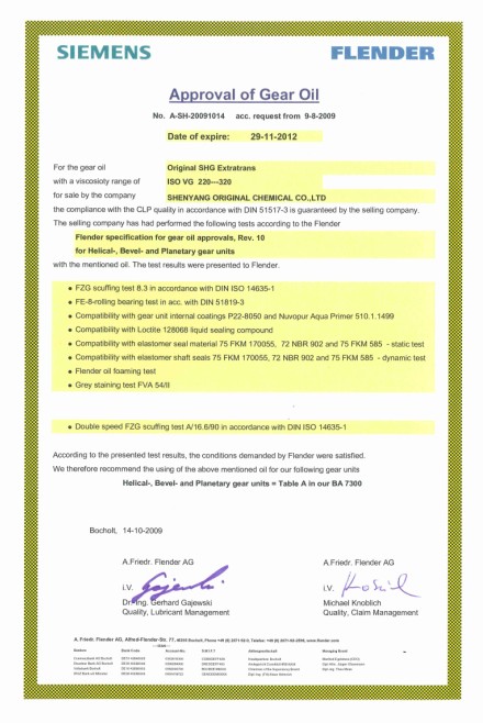 我公司的全合成PAO風力發(fā)電專用齒輪油已于2009年10月14日正式獲得德國西門子-弗蘭德公司的認證,今日我司接到了弗蘭德公司的正式通知。弗蘭德是全球最權(quán)威的風力發(fā)電機變速箱制造商。我司是國內(nèi)第一家獲此認證的潤滑油公司!