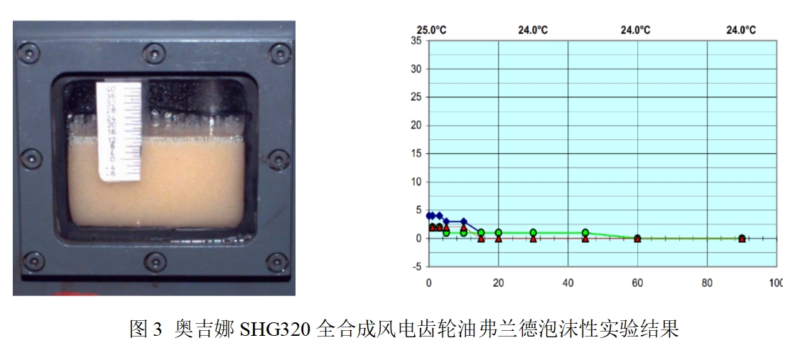 依據(jù)Flender(弗蘭德)泡沫性試驗GG-V425的試驗要求,對奧吉娜全合成風電齒輪油SHG320進行了泡沫性評價(實驗結果見圖3),在整個實驗過程中,形成的泡沫量不到5%,遠遠小于Flender試驗要求的15%,抗泡沫性能優(yōu)越。同時消泡劑的特殊結構也減少了過濾設備對它的吸附,使得使用過程中損耗減小,完全滿足了風電齒輪油長壽命的要求。