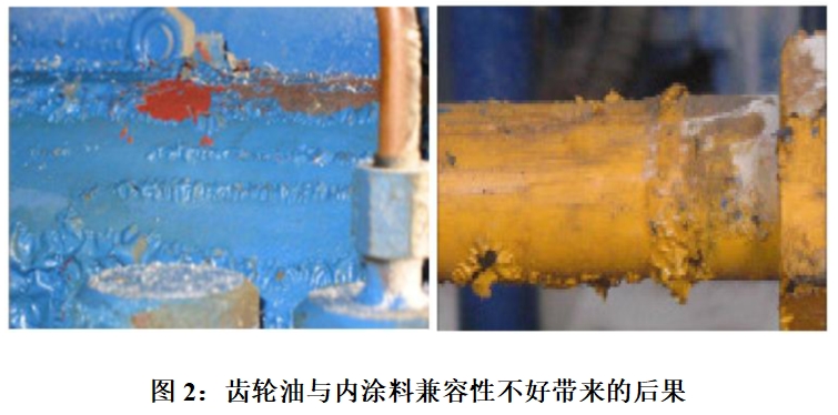 如果齒輪油和涂料兼容性不好,會導致內涂料松弛堆積甚至懸浮于齒輪油中,從而無法起到防腐蝕的作用,堵塞過濾器,甚至會縮短換油周期。圖2為內涂料與齒輪油兼容性不好的實例。